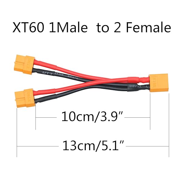 - Maixbomr 2Pcs Short XT60 Parallel Battery Connector Cable,14AWG 1 Male to 2 Female Y Splitter Adapter Cable,10cm/3.93inch for RC Multicopter Quadcopter with reliable performance and quality- FunctionCombine 2 batteries with the same mAh capacity Lithium Improve flight reliability and stability.to increase the flight time of RC model aircraft and realize fast charging or discharging.- Widely UsedThrough 1 male to 2 female Y splitter adapter cable,used for a variety of batter
