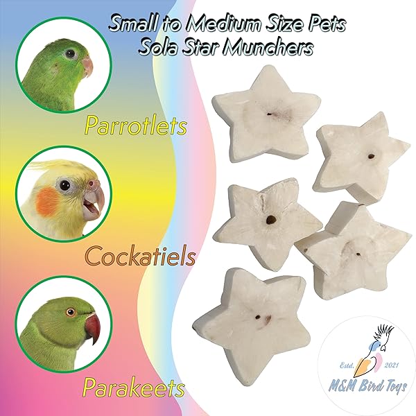 - Mandarin Bird Toys by M&M 5140 Sola Star Munchers - Handmade Sola Wood Bird Foot Toys, Lightweight, Chewable by Beaks and Shreddable by Feet, Satisfying for Pets, Provides Foraging Fun offers reliable performance and quality- The 5140 Sola Star Muncher Pk12 from M&M Bird Toys are delightfully fun to chew natural foot toys. These handcut mini sized stars are a delight for pets beak and feet to dig into