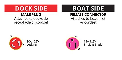 - Marinco P30-15 EEL Pigtail Adapter, 30A 125V Male to 15A 125V Female, Locking, Straight Blade offers reliable performance and quality- 30A 125V locking dock side male plug to 15A 125V straight blade boat side female connector- Fully molded and equipped with the Marinco unique sealing collar and covers for use in wet locations