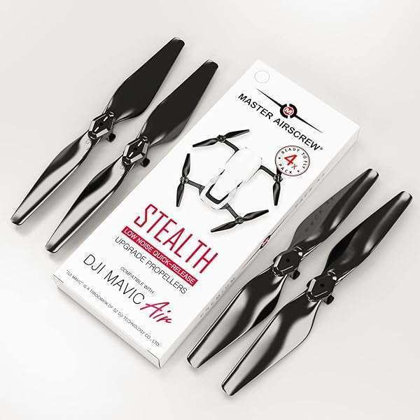 - Master Airscrew Stealth Propellers for DJI Mavic Air - Black, 4 pcs offers reliable performance and quality- Second Generation (V2) - Master Airscrew Stealth Propellers for Mavic Air- Up to 3.5 dB lower noise (50% reduction in noise power)- Up to 14% (2.8min) longer flight time, 20% RPMs reduction- Included in the Set: 4 propellers (2CW and 2CCW), carry pouch, MAS stickers, and safety sheet