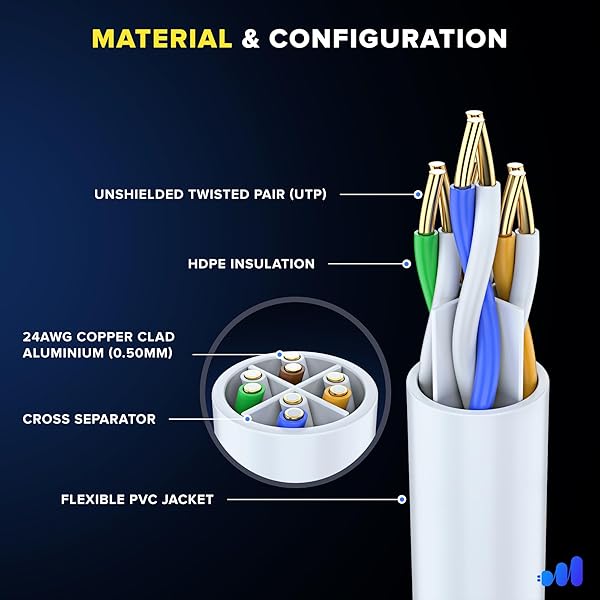 * Maximm Cat 6 Ethernet Cable 3 ft (20-Pack) - High-Speed LAN Cable, Internet Cable, Patch Cable, and Network Cable - UTP, 10Gbps, 550MHz Ethernet Cord - White: 24awg copper-clad aluminum conductor (0.50mm) * HDPE insulation * PVC jacket * Gold-plated RJ45 connectors * UTP (Unshielded Twisted Pair) 4 pairs strand with separator for reduced crosstalk