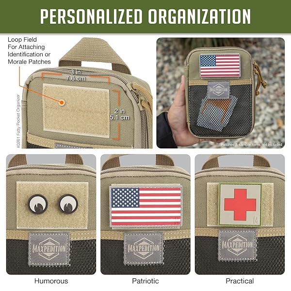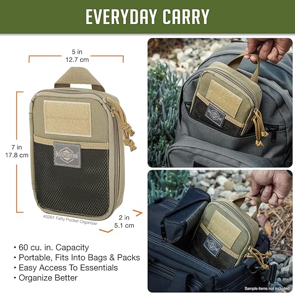 - Maxpedition Medium Fatty Pocket Organizer (Khaki) provides reliable performance and quality- Pockets: 1 slip, 1 zip, 1 exterior- Larger version of the popular Pocket Orgainzer.- Compact 5 x 7 x 2 size- Drops into or attaches onto backpack or bag