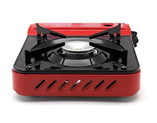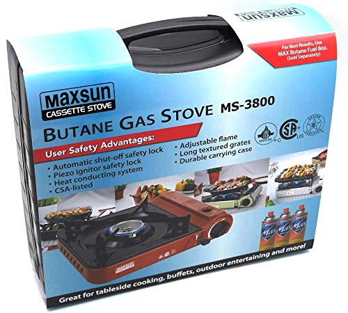 - Maxsun Portable Gas Stove MS3800 (Red), 9,560BTU High Power, Camp Stove, Outdoor/Indoor, with Carrying Case offers reliable performance and quality- Automatic shut-off safety lock. Piezo ignitor safety lock- Heat conduction system. 9560BTU- Adjustable flame. Long textured grates- Durable Carrying case