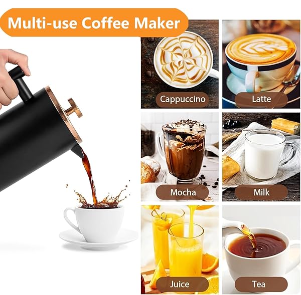 - Meelio Black French Press Stainless Steel 34oz, Double Wall Insulated Coffee Press 1L for travel camping with 2 Extra Filter Screens and 1 Coffee Spoon8cup 1000ml offers reliable performance and quality- Dimension- 6.9*4.1*8.5inch(17.5*10.5*21.5cm)1000ml French Press Brew up to 8 cups fine tasting coffee or tea, is the best choice to get the brewed coffee at home or for camping by family or friends