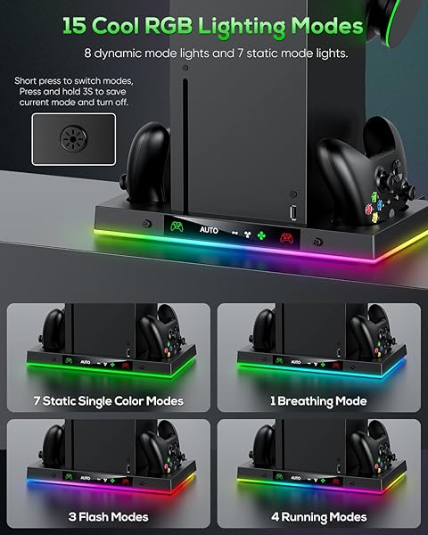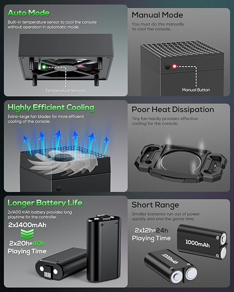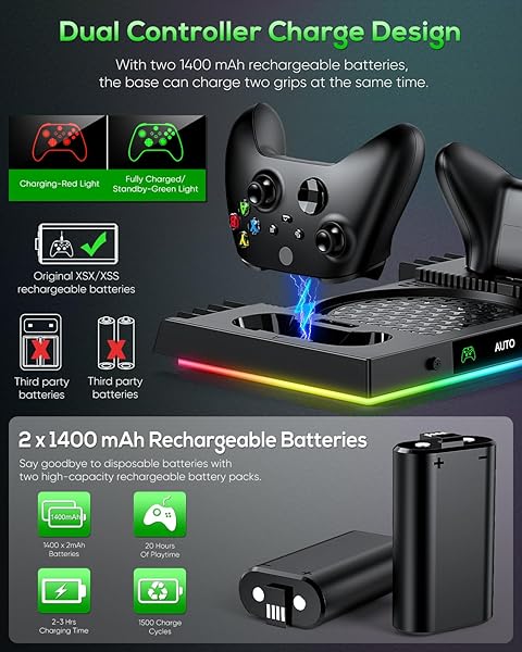 - Auto Cooling Fan and Charge Stand Accessories for Xbox Series X Console with 15 Light Modes, Wireless Dual Charger Dock for XSX Controller, 2* Rechargeable Batteries, Headset Stand & Game Disc Storage (Black) with reliable performance and quality- Great Accessories for Xbox Series X This accessory integrates multiple functions, including 1 top fan with automatic and manual modes for Xbox Series X console, 1 charge station and 2 rechargeable batteries for Xbox Series X controller,