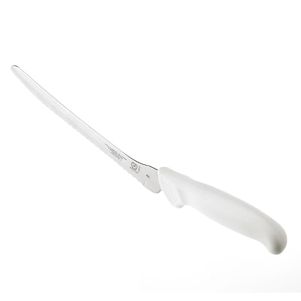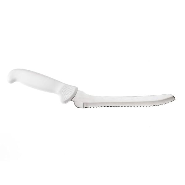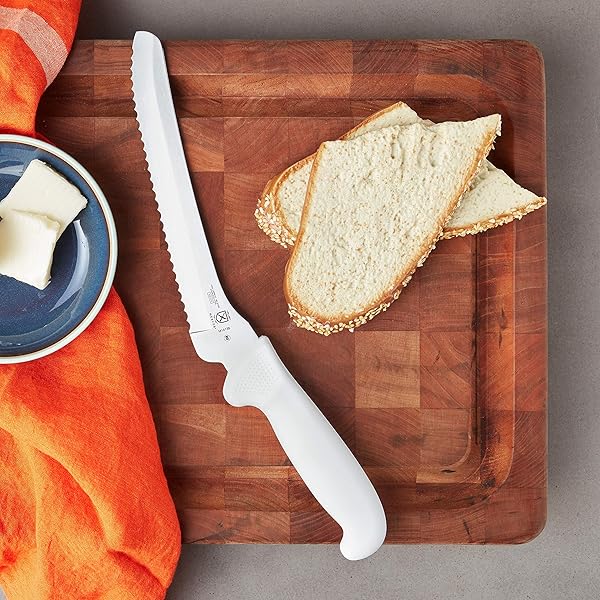 - Mercer Culinary Ultimate White, 8 Inch Offset Bread Knife offers reliable performance and quality- QUALITY CONSTRUCTION: Knives are crafted with high-carbon Japanese steel for easy edge maintenance and a razor sharp blade that lasts- SUPERIOR DESIGN: Built to last ergonomic handles with textured finger points offer a non-slip grip with added comfort, durability, and safety