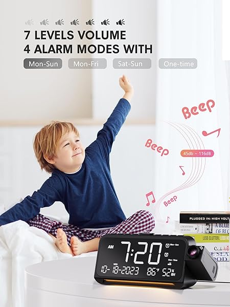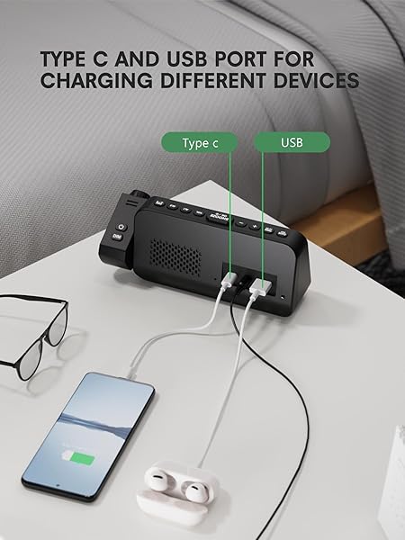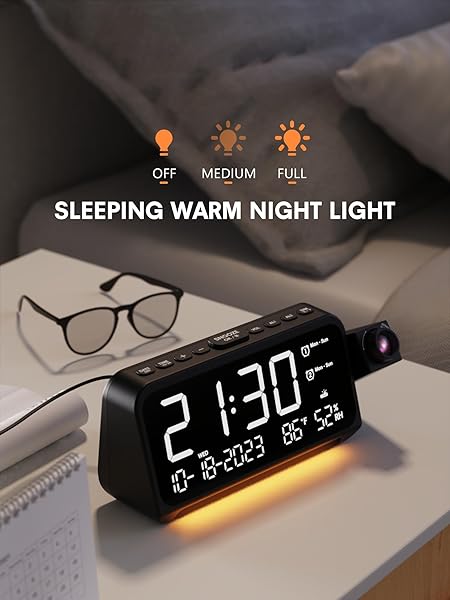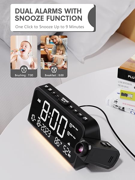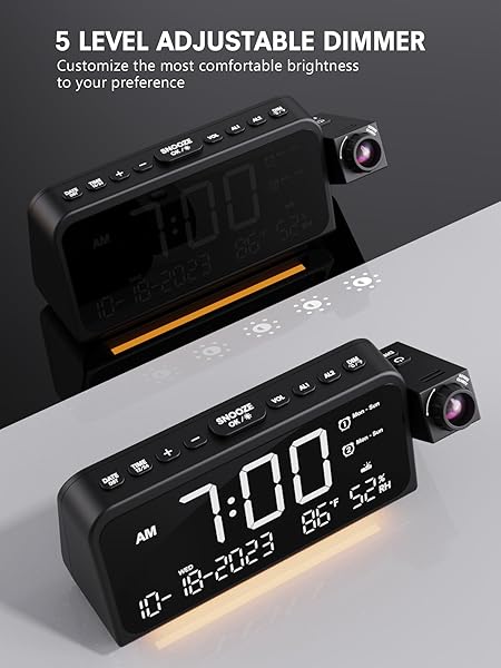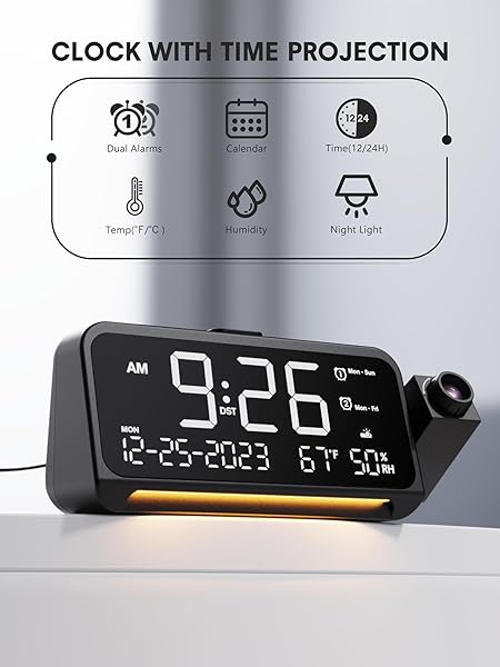 - Mesqool Projection Alarm Clock for Bedroom, Digital Clock with Projection on Ceiling with Night Light, Date, Temperature, Humidity, Type-C USB Charger, Snooze, Dual Alarms, Dimmer,12/24H with reliable performance and quality- Ceiling Projection Clock with 180Swivel Projector and Adjustable Focus RingEnhance your bedroom or office with this sleek and modern digital alarm clock. It projects time on your bedroom wall or ceiling with clear and sharp digits, the swiveling arm allows fo