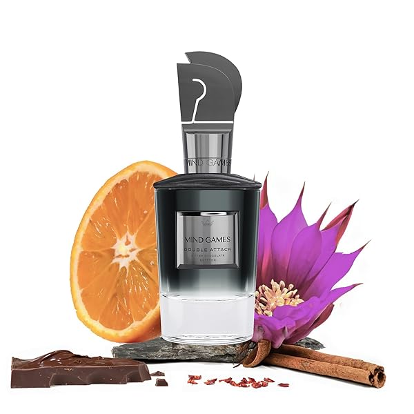 * MIND GAMES Double Attack - Luxury Perfume with Notes of Pimento Oil, Cinnamon Madagascar & Vetiver Bourbon - Elegant Extrait de Parfum for Women & Men - Woody & Edible Perfume - 100 mL/3.4 oz: unique fragrance: this captivating extrait de parfum features bittersweet chocolate and rich woody undertones * Woody & Citrus Fragrance Perfume: This fragrance features top notes of orange bitters and pimento oil with middle notes of cinnamon madagascar and drydown notes of dark chocolate and vetiver