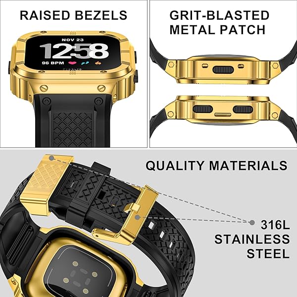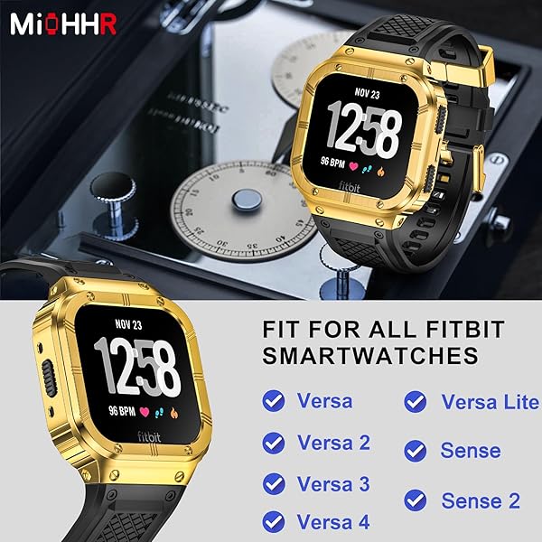 - MioHHR Stainless Steel Case and Band Compatible with Fitbit Versa 4/3/2/Lite/Sense/Sense 2 Bands with Metal Case, Rugged Sports Protector Cover Silicone Wristbands for Men, Gold with reliable performance and quality- Perfect fit: Our adjustable band fits Fitbit Sense 2/1, Fitbit Versa 4/3/2/1, and fits Fitbit Versa Lite. Adjustable band length to fit wrist size: 6.2"- 8.5"- Ultimate Protection: The 316L stainless steel fitbit watch case is rugged and rust-resist, raised bez