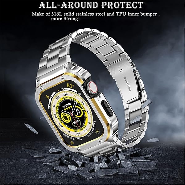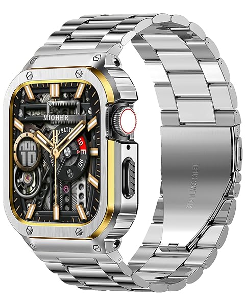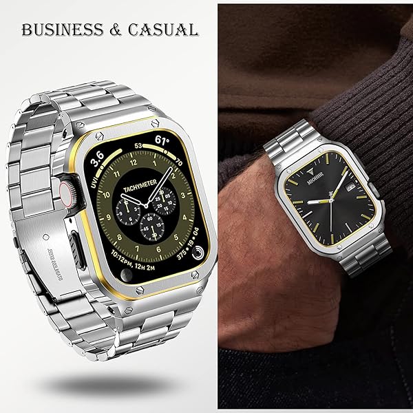 - MioHHR Stainless Steel Band and Case Compatible with Apple Watch Band 41mm 40mm 38mm, Men Metal Protective Bumper Cover for iWatch Series 9/8/7/6/5/4/3/2/1/SE/SE2/SE3, Silver/Gold with reliable performance and quality- Compatibility: Stainless steel watch band and case compatible with apple watch 38mm (Series 3/2/1) 40mm (Series 6/5/4/SE3/SE2/SE), 41mm (series 9/8/7), and the band fit wrists from 6"-8.8" (152mm-215mm). Comes with tool to adjust the length, please follow the correc