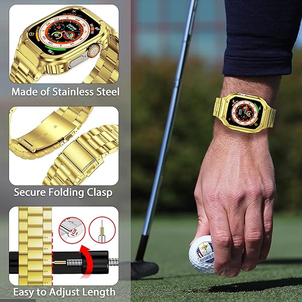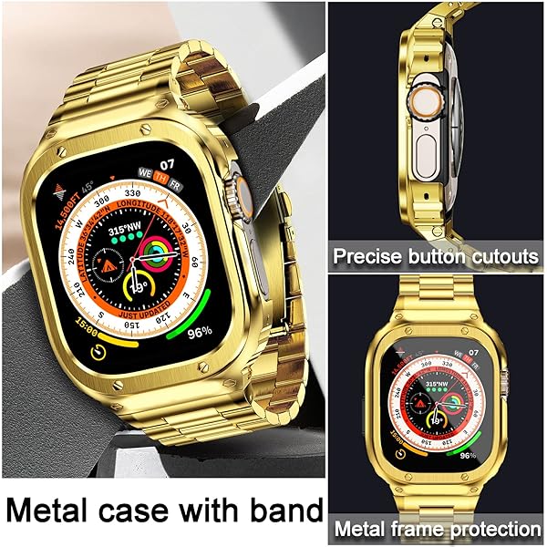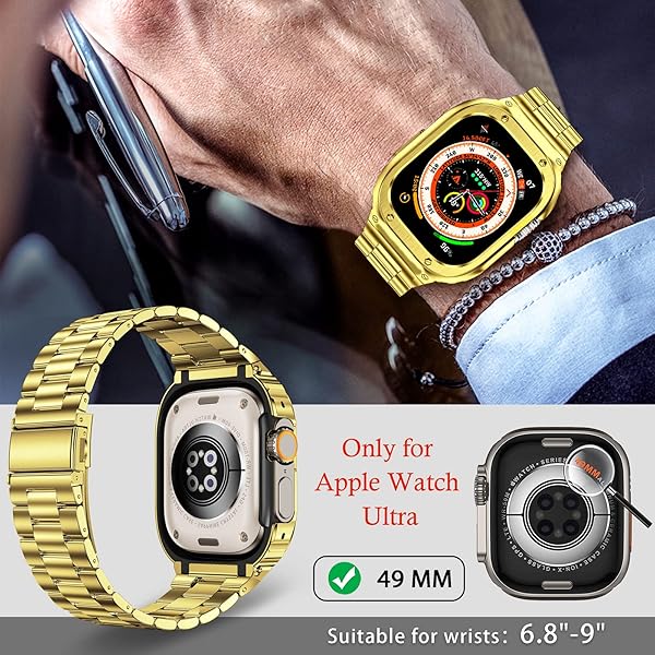 - MioHHR Stainless Steel Band and Case Compatible with Apple Watch Band 49mm, Men Metal Protective Bumper Cover for iWatch Series Ultra 3/2/1, Gold with reliable performance and quality- Compatibility: Stainless steel watch band and case compatible with apple watch 49mm(Ultra 3/2/1), and the band fit wrists from 6.8"-9". Comes with tool to adjust the length, please follow the correct procedure to remove and adjust the strap to avoid damage- Safe and Durable: Metal case compat