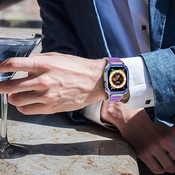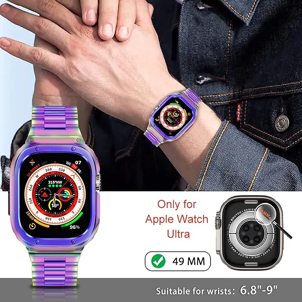 - MioHHR Stainless Steel Band and Case Compatible with Apple Watch Band 49mm, Men Metal Protective Bumper Cover for iWatch Series Ultra 3/2/1, Multicolor with reliable performance and quality- Compatibility: Stainless steel watch band and case compatible with apple watch 49mm(Ultra 3/2/1), and the band fit wrists from 6.8"-9". Comes with tool to adjust the length, please follow the correct procedure to remove and adjust the strap to avoid damage- Safe and Durable: Metal case