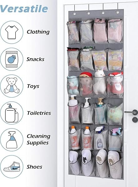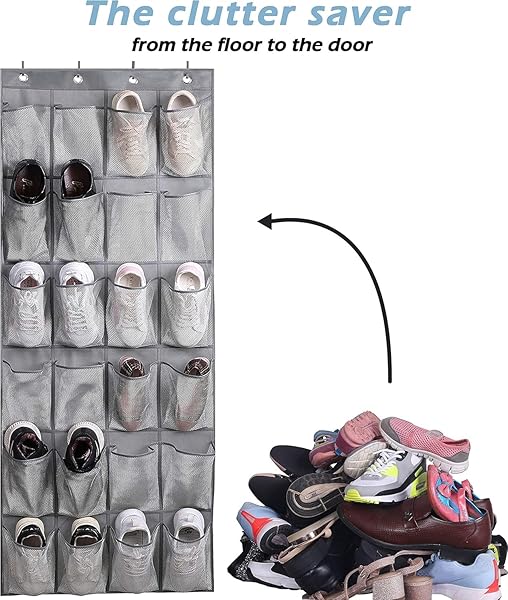 - MISSLO Over The Door Shoe Organizer Hanging Closet Holder Hanger Storage Bag Rack with 24 Large Mesh Pockets, Gray offers reliable performance and quality- 24 roomy clear see through mesh pockets organizes up to 12 pairs of shoes- 4 over the door hooks included, the maximum width of door that fits the hook is 1.65 inches- The door hanger shoe rack could easily be cut in half horizontally, and can be fold very small for travel storage