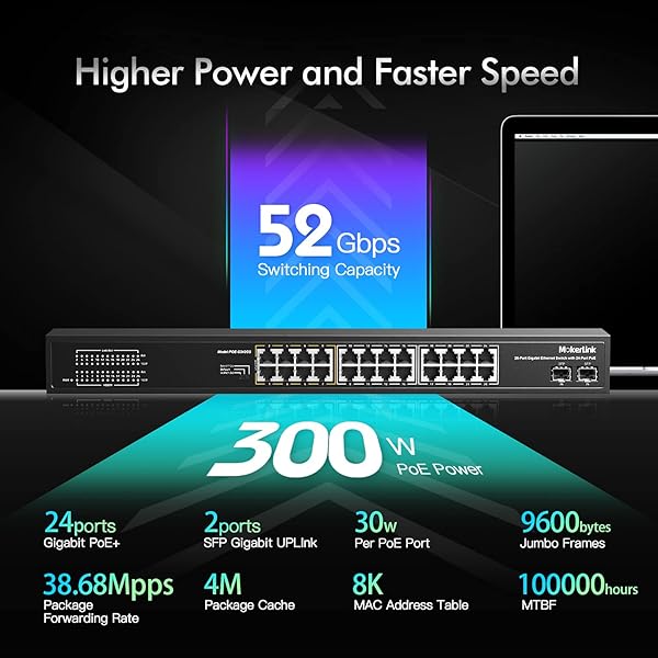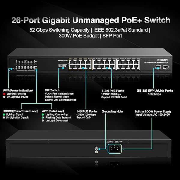 - MokerLink 26 Port Gigabit PoE Switch, 24 Gigabit PoE+ Ports, 2 Gigabit SFP Uplink, 300W IEEE802.3af/at, Fanless Rackmount Unmanaged Plug and Play Ethernet Switch offers reliable performance and quality