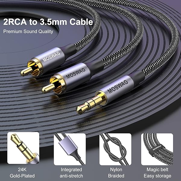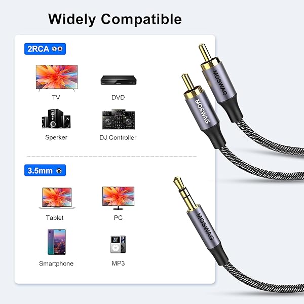 * MOSWAG 1/8 to 2RCA Male Cable Audio Adapter 6.6ft/2M RCA Auxiliary Hi-Fi Sound Shielded Stereo Flexible RCA Y Splitter Cable Cord Metal Shell Compatible with Smartphone Speakers Tablet HDTV MP3 Player: 2rca to 3.5mm cable 3.5mm to 2 rca stereo cable is great for connecting portable audio devices * Such as a Smartphone * MP3 player or tablet to a stereo receiver * Speaker * Amplifier