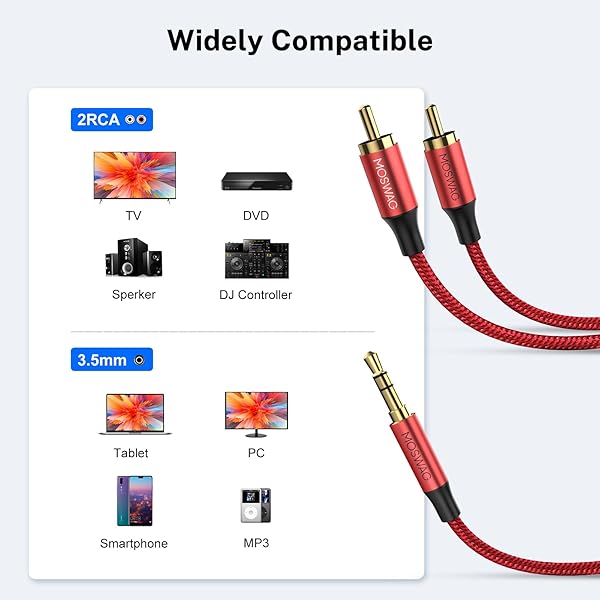 - MOSWAG RCA Cable, 3.5mm Male to 2RCA Male Stereo Audio Adapter Dual Shielded Gold-Plated Coaxial Cable Nylon Braided AUX RCA Y Cord for Smartphones,MP3,Tablets,Speakers,HDTV with reliable performance and quality- 2RCA to 3.5mm Cable 3.5mm to 2 RCA stereo cable is great for connecting portable audio devices, such as a Smartphone , MP3 player or tablet to a stereo receiver, Speaker, Amplifier, TV, Car and other RCA-enabled devices.- Excellent Sound QualityThis 3.5mm to 2RCA A