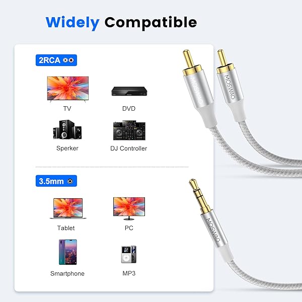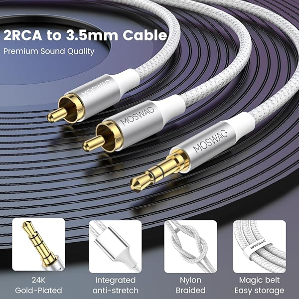 - MOSWAG RCA Cable, 3.5mm Male to 2RCA Male Stereo Audio Adapter Dual Shielded Gold-Plated Coaxial Cable Nylon Braided AUX RCA Y Cord for Smartphones,MP3,Tablets,Speakers,HDTV with reliable performance and quality- 2RCA to 3.5mm Cable 3.5mm to 2 RCA stereo cable is great for connecting portable audio devices, such as a Smartphone , MP3 player or tablet to a stereo receiver, Speaker, Amplifier, TV, Car and other RCA-enabled devices.- Excellent Sound QualityThis 3.5mm to 2RCA A