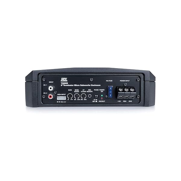 - MTX Terminator TN8MS 8" Powered Subwoofer provides reliable performance and quality- powered subwoofer with high-density aluminum enclosure and metal grille- 8" shallow-profile woofer- Class A/B amplifier: 135 watts RMS (200 watts peak)- High performance for daily use
