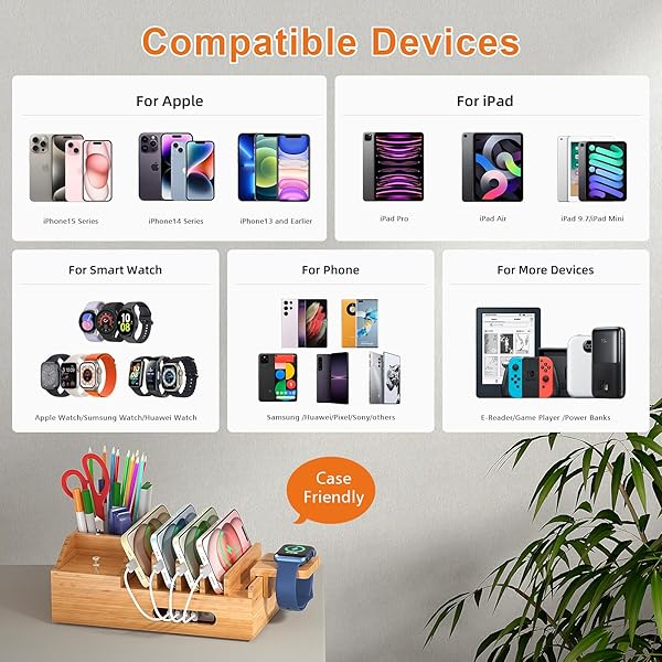 - Bamboo Charging Station for Multiple Devices with 5 Port USB Charger, 5 Charger Cables and Smart Watch Stand. Wood Desktop Dock Stations Electronic Organizer for Cell Phone, Tablet, Watch, Office offers reliable performance and quality- What You Get: 1x Bamboo Dock Rack; 1x Charger Power Supply (USB HUB 5Ports); 1Set of 5 Cables(Length:1FT; Includes 2x l0S cables, 1x Android cables, 2x Type-C cable). An extra Hanging Dock Stand for Smart Watch