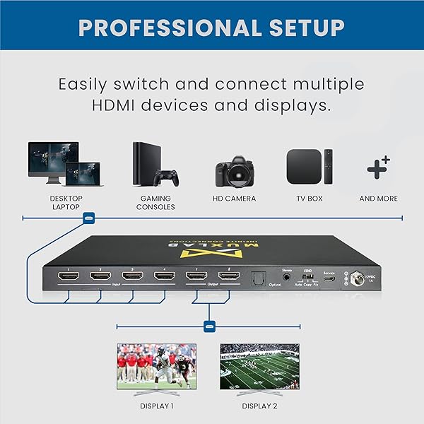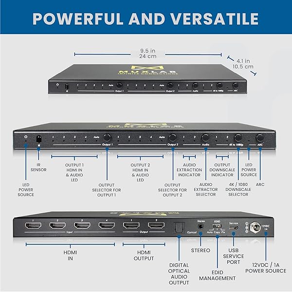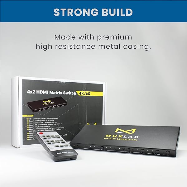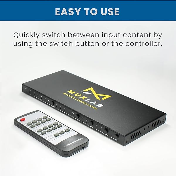 MuxLab 4x2 HDMI 2.0 4K 60hz Matrix Switcher | IR Remote | Supports 4K@60Hz | 4:4:4 | HDR | 4 in 2 Out | No Driver | Control with IR Remote | Push Button | Switcher and Splitter