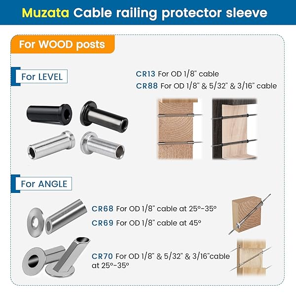 * Muzata 100 Pack 1/8" Black Cable Railing Protector Sleeves T316 Stainless Steel Protective Sleeves Deck Cable Railing Hardware Kit for Wood Posts CR13: for wood post in level: these stainless steel black protective sleeves fits 1/8" wire rope on wood posts and wood posts with pvc sleeves * NOT for angle applications or metal posts * They prevent the wire rope from being damaged by friction wear * If you want protective sleeves fit for 5/32" 3/16" wire rope * Please search Muzata CR88