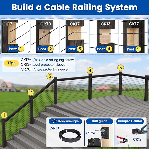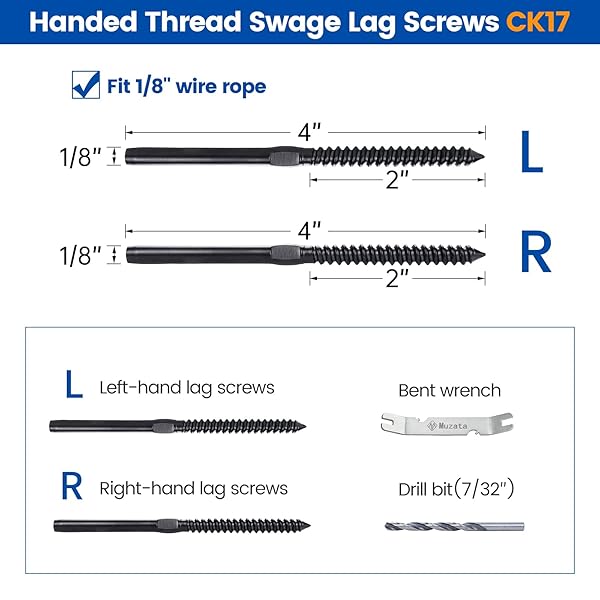 * Muzata 120 Pack 1/8" Black Cable Railing Hardware Kit Swage Lag Screws Left and Right Handed Thread for Wood Post T316 Stainless Steel Deck Cable Railing System 60 Pairs CK17: left and right feature: package comes with 60 left and 60 right black cable railing lag screws for 60 cable runs * 1 drill bit * And 1 reinforced bent wrench * This cable railing hardware is designed to rotate wire rope in the same direction to avoid twisting or damaging the wire rope * Professional hydraulic crimper