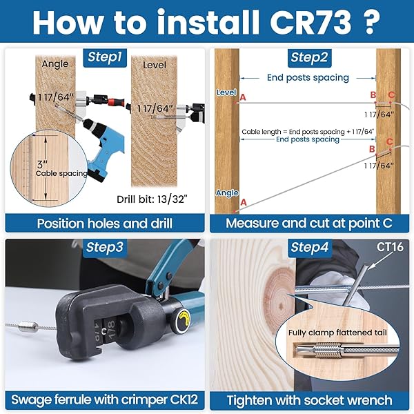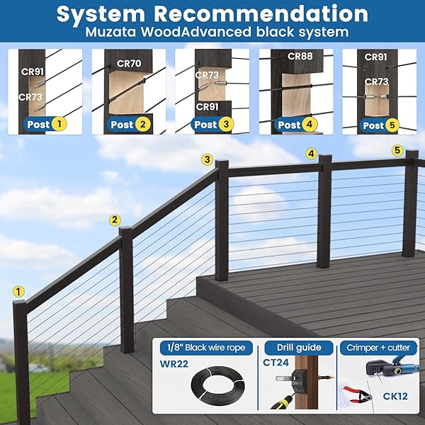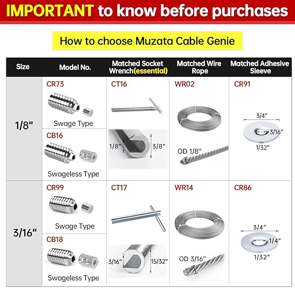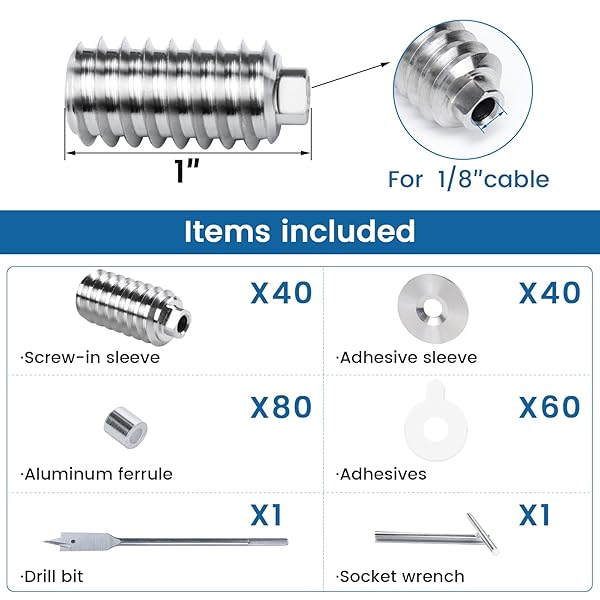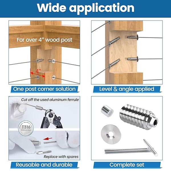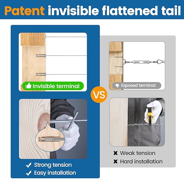 * [Patent] Muzata 40 Pack 1/8" Invisible Cable Railing Kit Hardware Swage Lag Screw Hidden for 4x4 6x6 8x8 Wood Posts T316 Stainless Steel Deck Cable Railing System 20 Pairs CR73: completely invisible: with our patent invisible flattened tail design * You can hide the ugly swaged end inside the wood post to get a neat appearance * And get enough tension to pass 4sphere test to meet code compliance * The customized Socket Wrench is essential for the invisible installation and keeps the cable from