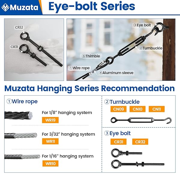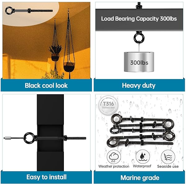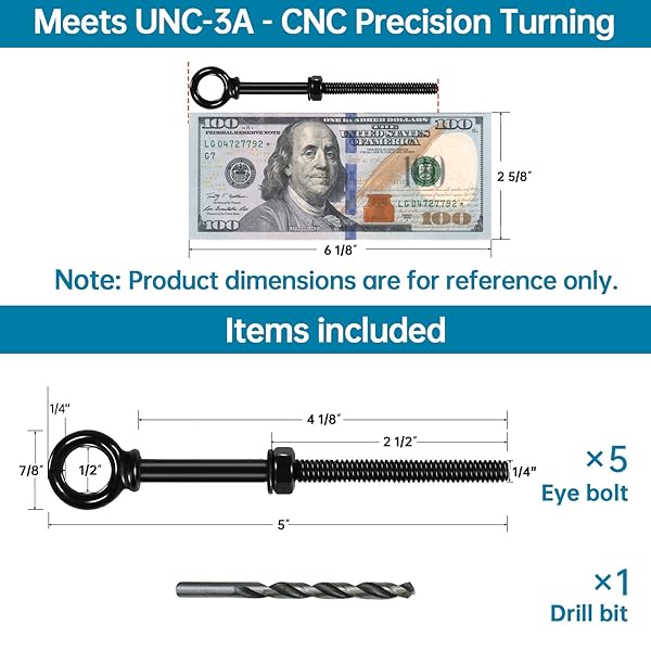 - Muzata 5 Pack 1/4" x 5" Black Eye Bolts with Nuts Washers T316 Stainless Steel Eyebolts Heavy Duty Threaded Shoulder Lifting Ring Marine Grade UNC-3A CR32 with reliable performance and quality- Size to Know: 5pcs eye bolts, 5pcs nuts, 5pcs washers and 1pc drill bit. Overall length= 5", hole inside dimension= 1/2", hole outside dimension= 7/8", thread length= 2 1/2", thread size= 1/4"-20, hole thickness=1/4", mountable length=4 1/8"- Cool Black Outlook: The eye bolt presents