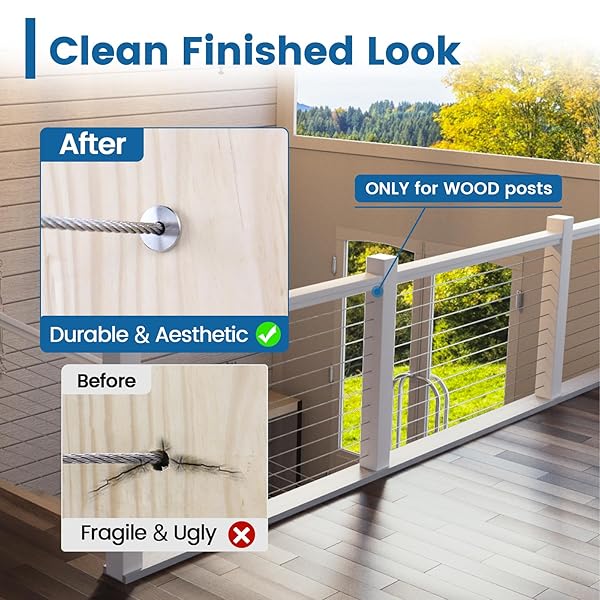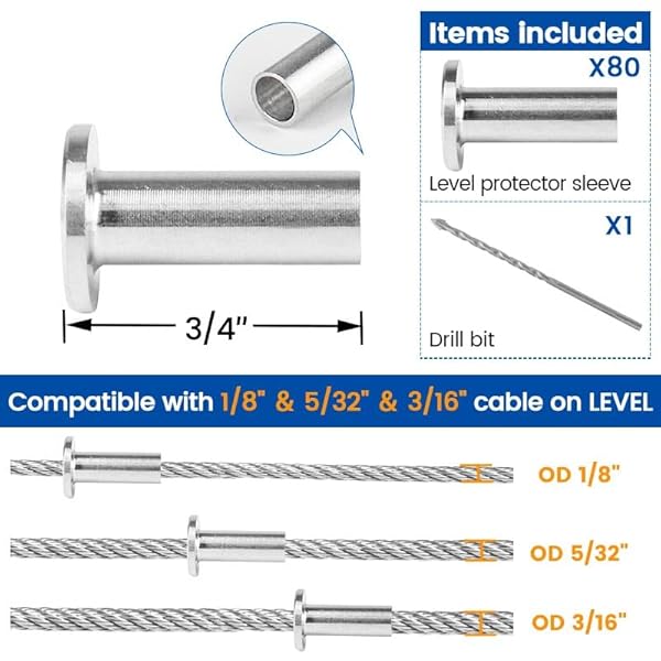 * Muzata 80 Pack 1/8" 5/32" 3/16" Cable Railing Protector Sleeves T316 Stainless Steel Protective Sleeves Deck Cable Railing Hardware Kit for Wood Posts CR88: protective function: these stainless steel protective sleeves fit 1/8" 5/32" 3/16" wire rope in level wood posts * They prevent the wire rope from being damaged by friction wear * Adding these protective sleeves will make it easier to stretch cable through posts and also help to maintain proper cable tension * Package includes: 80 Packs