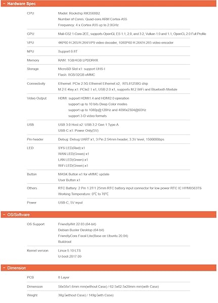 - Nanopi R5C Mini WiFi Router OpenWRT with Dual PCIe 2.5Gbps Ethernet M.2 WiFi Bluetooth Ports 4GB LPDDR4X RAM Based in Rockchip RK3568B2 Soc for IOT NAS Smart Home Gateway (with M.2 WiFi Module) with reliable performance and quality- [Wireless Mobile Mini Travel Router] Nanopi R5C Mini Wifi Router Adopt Rockchip RK3568B2 SoC with 4GB LPDDR4x RAM and 32GB eMMC. CPU: Quad-core ARM Cortex-A55 CPU, up to 2.0GHz. 0.8T NPU. GPU: Mali-G52 1-Core-2EE, supports OpenGL ES 1.1, 2.0, and 3.2,