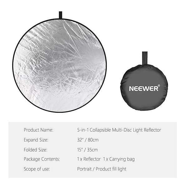 - NEEWER 32-Inch 80CM Portable 5 in 1 Translucent, Silver, Gold, White, and Black Collapsible Round Multi Disc Light Reflector for Studio or any Photography Situation provides reliable performance an...- 5 reflectors, 5 effects. Modify and use natural and artificial light to your advantage to obtain perfect shots every time- 1 panel with 5 possibilities. Includes: Gold, silver, white, black and translucent reflectors