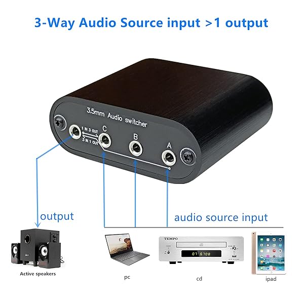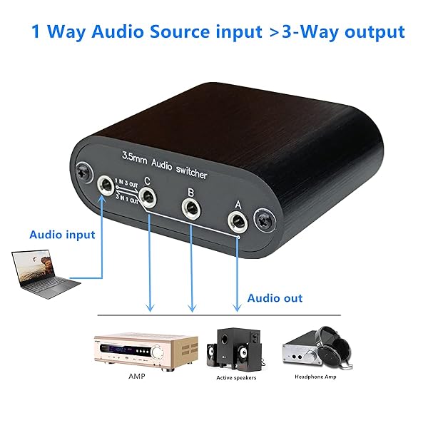 * New D3 3(1)-in-1(3)-Out 3.5mm Stereo Audio Switch Source Input Signal switcher selector Splitter Box Mini: d3 is a mini size audio input signal switch box * You can select signal and without plug/replug cables or using the music player any more * >>3 in 1 out: Support up to 3 audio source inputs and select 1 audio source output (You can refer to the "use example 1" of the product picture ) * >>1 in 3 out: 1 audio source input,and 3 ports output can be switch to amp or active speakers or