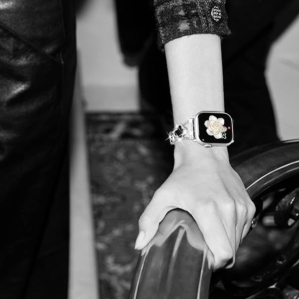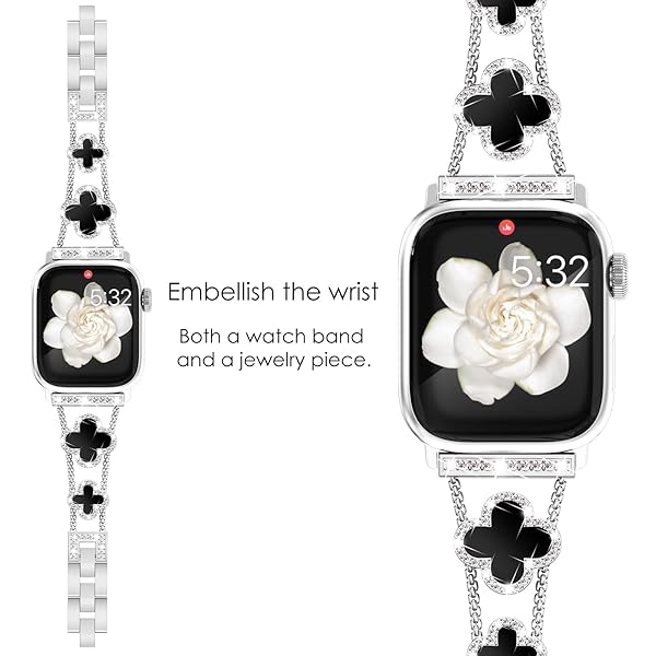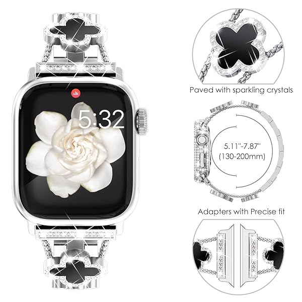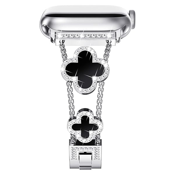 - NewWays Compatible for Apple Watch Band Series 11 10 42mm Series 9/8/7 41mm Series 6/5/4 40mm Series3 38mm for Women, Bling Diamonds Four Leaf Clover Bracelet for iWatch Womens, Silver/Black with reliable performance and quality- Luxurious 4-Leaf Clover Design: Designed by a French artist, NewWays for Apple Watch bands feature a four-leaf clover symbolizing luck, elevating your watch to a stunning jewelry piece. This versatile strap complements any outfit.- Sparkling Diamio