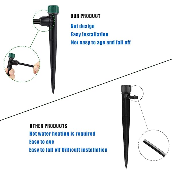 - Anti-Drop Drip Irrigation Emitters for 1/4" Drip Tubing,5.5" Stake with Adjustable Automatic Irrigation Drippers for (4-7mm) Garden Watering System. (50pcs-360 Degree Drip) with reliable performance and quality- Premium Material:5.5 inch Stake Height made of high quality plastic material.Compared with other Emitters, it is not easy to damage and break aging.Ensure a long service life.The nut will keep the line more secure and keep it from coming loose in the warmer months.1 set to