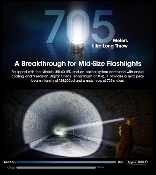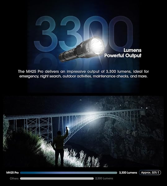 - Nitecore MH25 Pro 770 Yard Long Throw Flashlight, 3300 Lumen USB-C Rechargeable Compact Duty Work Light with Lumentac Organizer with reliable performance and quality- LONG THROW FLASHLIGHT - 3300 lumen output with over 771 yards of throw. A truly indispensable companion for daily carry, work, patrol, search and rescue, or hiking, caving and hunting.- USB-C RECHARGEABLE - via built-in waterproof USB-C port. A battery status indicator next to the side button reminds you when