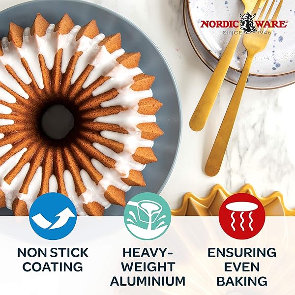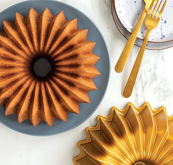 - Nordic Ware Brilliance Bundt, 10 Cup, Gold offers reliable performance and quality- Genuine Bundt pans are made of durable cast aluminum to achieve the most crisp, intricate cake detail possible- Cast aluminums superior heat conductivity ensures controlled, even browning of cakes and treats- Premium silicone nonstick is free of PFAS and PTFE for healthy baking and ensures effortless release and cleanup
