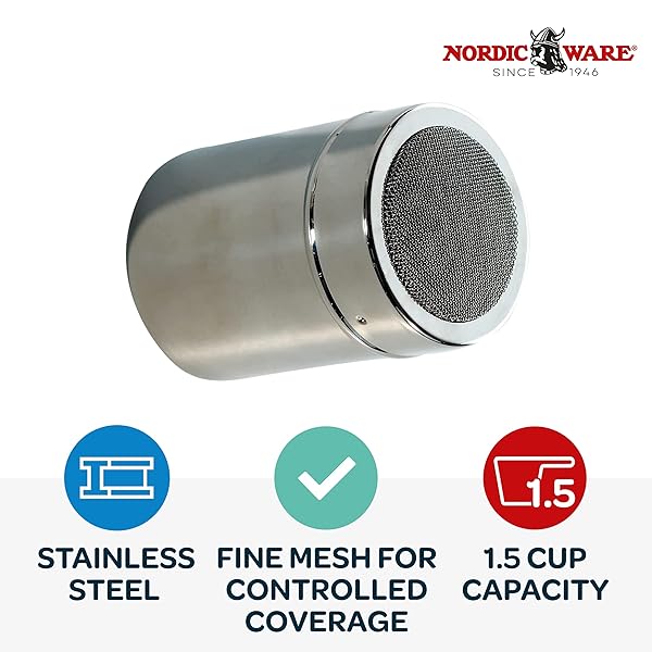 - Nordic Ware Powdered Sugar Duster offers reliable performance and quality- Add perfect puffs of powdered sugar to your Bundts and other sweet treats with this classic stainless steel design- the perfect tool to add final touches to your baked goods or use it to mix cinnamon and sugar for the perfect cinnamon toast- Fine mesh screen with a 1.5 cup capacity