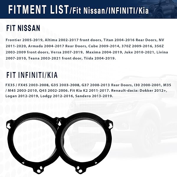 - NuIth 6.5 inch Door Speaker Adapter Bracket for Nissan Altima Frontier NV Titan 2002-2019, Infiniti FX35 G35 G37 Q45 2002-2013 Mount Aftermarket Car Speaker Spacer Ring offers reliable performance and quality- 6.5 inch door speaker adapter replacement for Infiniti: FX35 / FX45 2003-2008, G35 2003-2008, G37 2008-2013 Rear Doors, I30 2000-2001, M35 / M45 2003-2010, Q45 2002-2006; for Renault-dacia: Dokker 2012-up, Logan 2012-2019, Lodgy 2012-2016, Sandero 2013-2019