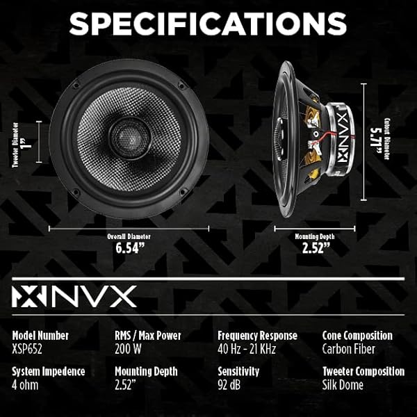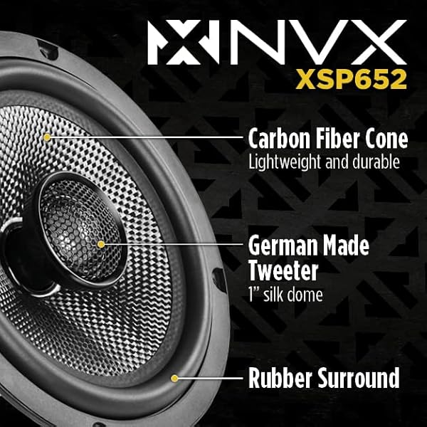 - NVX XSP652 6.5" Car Speakers, 600W Max, 200W RMS, 2-Way 6-1/2 inch Coaxial w/ 1" Silk Dome Tweeters & Built-in X-Overs, Easy to Install in Cars/Trucks/Doors (Pair): reliable performance and quality- Exceptional Audio Performance: Elevate your car audio- Premium Materials: Constructed with lightweight carbon- Precision Tweeter Technology: Featuring 1" silk dome- Reliable Power Handling: With a peak power of 600