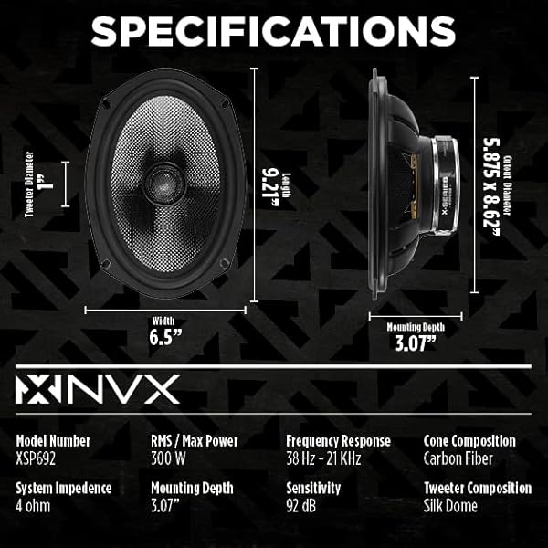 - NVX XSP692 6x9 Car Speakers, 600W Max, 300W RMS, 2-Way Coaxial w/ 1" Silk Dome Tweeters & Built-in X-Overs, Easy to Install in Cars/Trucks/Doors (Pair): reliable performance and quality- Exceptional Audio Performance: Experience unparalleled- Premium Materials: Crafted with lightweight carbon- Precision Tweeter Technology: Equipped with 1" silk- Reliable Power Handling: With a peak power of 900