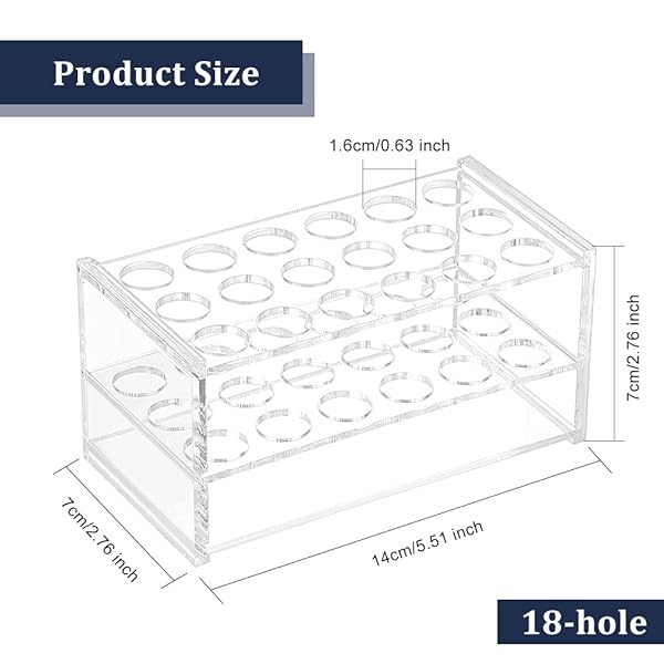 - OLYCRAFT 18 Sockets Acrylic Clear Test Tube Rack Transparent Acrylic Test Holder Rack Centrifuge Tube Holder Labortory Display Stands Lab Supplies 16mm Diameter for Test Tubes Chemistry Laboratory with reliable performance and quality- 18-Well Test Tubes -- Designed with 18 sockets, which is about 70mm wide, 140mm long, 70mm high, each with a diameter of 16mm, can accommodate 18 Pcs 10ml test tubes, providing more capacity and convenience for experimental use.- Three Layer