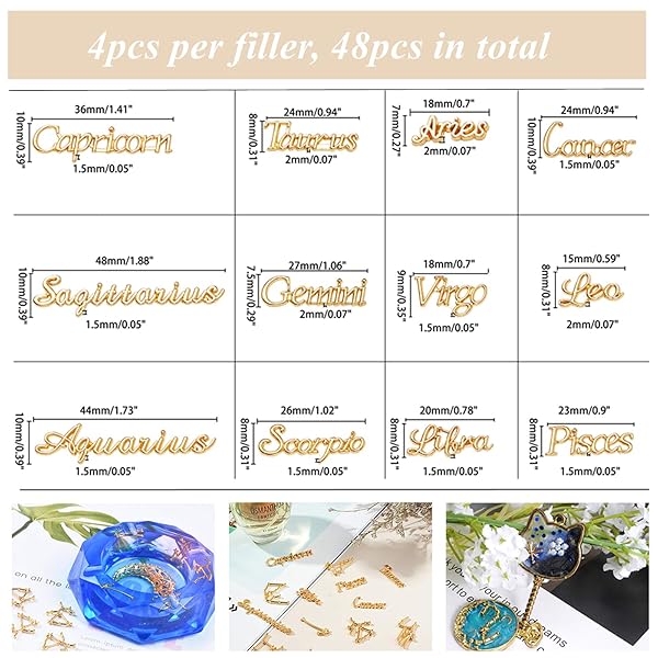 - OLYCRAFT 96Pcs Zodiac Sign Resin Fillers 2-Style Constellation Words Star Sign Alloy Epoxy Resin Supplies Filling Accessories for Resins Crafting and Jewelry Making - Golden offers reliable performance and quality- 12 ZODIAC SIGN & WORDS--Unique constellation sign fillers with corresponding words of Aries, Taurus, Gemini, Cancer, Leo, Virgo, Scorpio, Sagittarius, Capricorn, Aquarius, Pisces make it easier to craft terrific constellation related crafts and jewelries