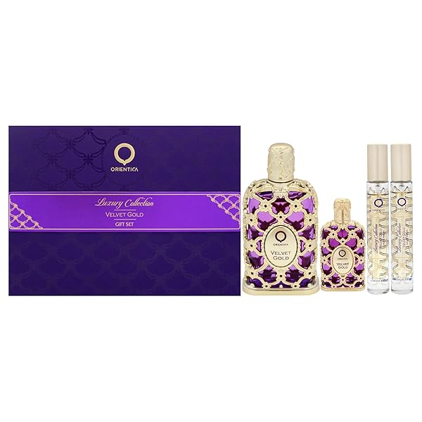 * Orientica Velvet Gold Gift Set Eau De Parfum Vanilla, Bergamot, Gourmand, Caramel, Violet, Patchouli, Rose, Musk, Animalic, Amber - Arabic Perfume for Men & Women - 2.7oz + 2 x 0.33oz Spray: launched by the design house of orientica * Velvet Gold makes a magnificent debut with the visual appeal * Top notes of zesty bergamot * Smooth caramel * Romantic violet.Middle note Powdery