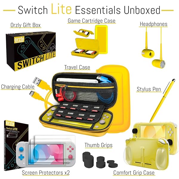 - Orzly Switch Lite Accessories Bundle - Case & Screen Protector for Nintendo Switch Lite Console, USB Cable, Games Holder, Comfort Grip Case, Headphones, Thumb-Grip Pack & more (Orzly Gift Pack Yellow): reliable performance and quality- SWITCH LITE ACCESSORY BUNDLE: A great value- ESSENTIAL SWITCH LITE ACCESSORIES: Includes- USEFUL EXTRAS: A spare Switch Lite USB- ADDED BONUS: A Comfort Grip Case makes for
