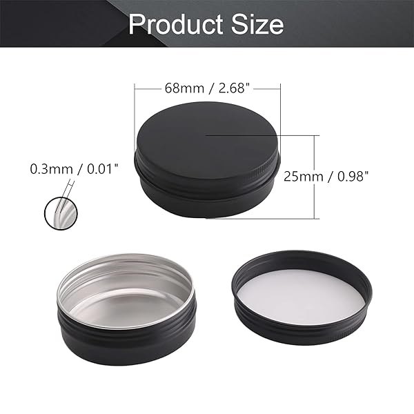 - Othmro 6pcs 2oz Metal Round Tins Aluminum Tin Cans Containers with Screw Lid, 68 * 25mm(DxH) Black tin cans for Salve, Spices, Lip Balm, Tea or Candies 60ml offers reliable performance and quality- BASIC INFORMATIONCapacity: 60g/60ml/2 oz; Dimensions: 68350.3mm (DxHxT); Material: Aluminum Alloy- HIGH QUALITYMade from Aluminum alloy, can be recycled or re-used making them really eco-friendly
