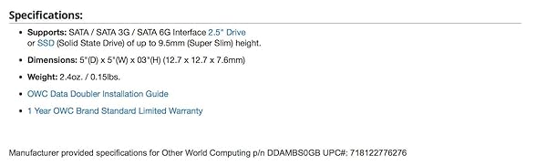 - OWC Data Doubler, Optical to SATA HD Converter Bracket Solution for Mac Laptops, (OWCDDAMBS0GB) provides reliable performance and quality- Optical to SATA Drive Converter Bracket Solution- Supports: SATA / SATA 3G / SATA 6G Interface 2.5" Drive or SSD (Solid State Drive) of up to 9.5mm (Super Slim) height- Dimensions: 5"(D) x 5"(W) x 03"(H) (12.7 x 12.7 x 7.6mm)