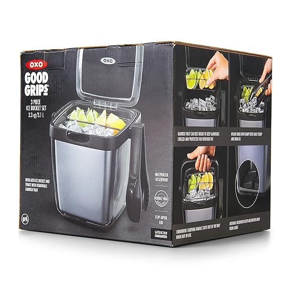 - OXO Good Grips Double Wall Ice Bucket with Tongs and Garnish Tray offers reliable performance and quality- Removable garnish tray rests inside Bucket to keep garnishes chilled and protected- Convenient carrying handle stays out of the way when not in use- Nylon tongs with sharp teeth easily scoop and grab ice- Tongs hang from either side of bucket for convenient storage