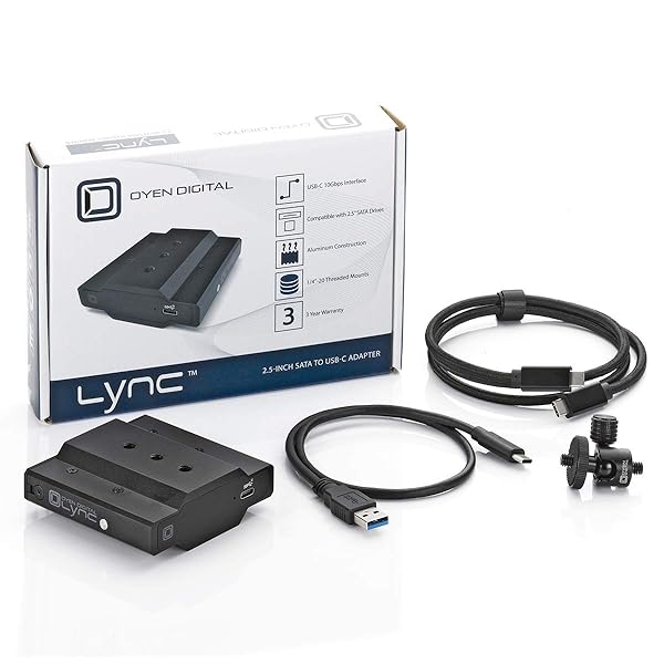 * Oyen Digital Lync USB-C to SSD Camera Drive Dock, L1-C25-BK: usb-c (10gbps) * Compatible with all USB & Thunderbolt 3 * Supports 2.5-inch SATA drives (up to 9.5mm) * Includes ball head mount and six 1/4-20 mount holes for flexible positioning * Rubber sealed dust flap covers the opening when not in use