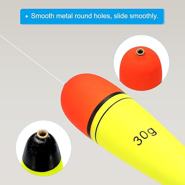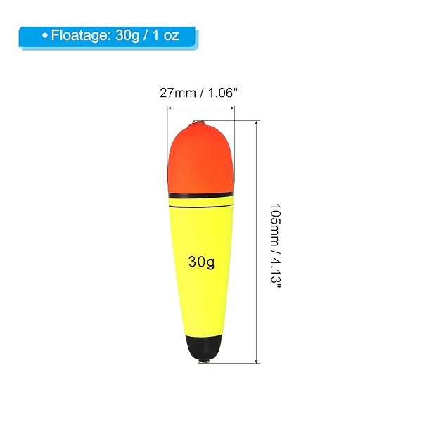 - PATIKIL 1oz Fishing Slip Bobbers, 4 Pack EVA Fishing Float for Sea Fishing Freshwater, Yellow with reliable performance and quality- Floatage: 30g / 1 oz; Diameter: 27mm / 1.06 inch; Overall Length: 105mm / 4.13 inch; Packing List: 4 x Fishing Slip Bobber- Advantage: Smooth metal round holes at both ends help the line slide smoothly and not get stuck.- Instruction: Simply thread the float stopper and fishing bead onto the line in sequence, then thread the slip bobber