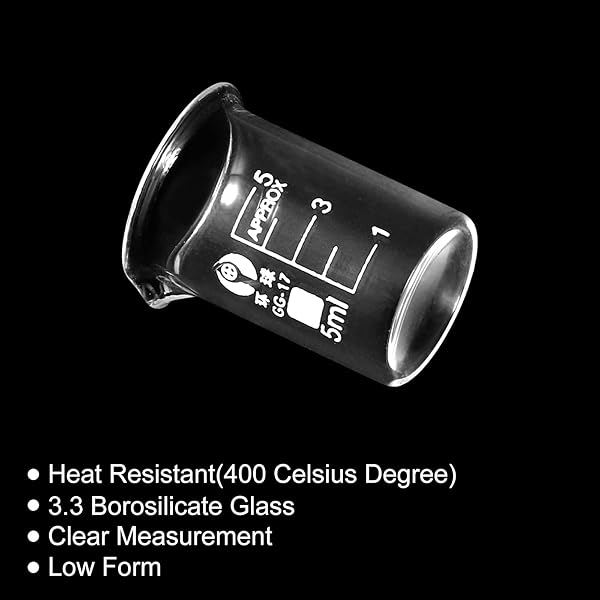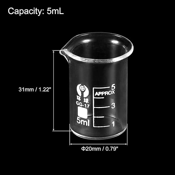 - PATIKIL 3Pcs 5ml Low Form Glass Beaker, 3.3 Borosilicate Glass Graduated Printed Scale Measuring Cups with Spout for Kitchen Lab Liquids with reliable performance and quality- Specification: Capacity: 5ml; Minimum Scale Value: 1ml; Material: Borosilicate Glass; Max Temperature: 400 Celsius Degree; Overall Size: 20 x 31mm / 0.79 x 1.22"; Package Contents: 3 x Glass Beaker- Advantages: Borosilicate glass material has good heat and corrosion resistance, durable to use. Made wi